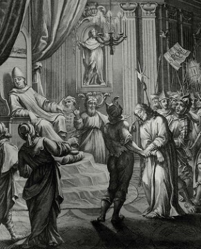 Christ’s earthly ministry in the Phillip Medhurst Bible 348 of 550 Jesus is brought before Caiaphas Matthew 26:57 Caspar Luyken