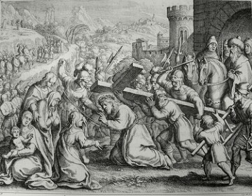 Christ’s earthly ministry in the Phillip Medhurst Bible 407 of 550 Jesus is led to crucifixion Matthew 27:31-32 Merian