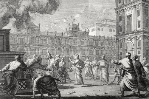 Phillip Medhurst presents John’s Gospel: Bowyer Bible print 5386 Christ teaches in the temple John 7:14-15 Luyken and son in Mortier’s Bible on Flickr. A print from the Bowyer Bible, a grangerised copy of Macklin’s Bible in Bolton Museum and Archives, England.
