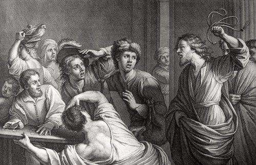 Phillip Medhurst presents John’s Gospel: Bowyer Bible print 5311 Christ drives the traders out of the temple John 2:14-16 after Manfredi on Flickr.