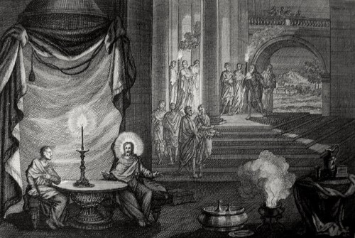 Phillip Medhurst presents John’s Gospel: Bowyer Bible print 5305 Christ receives Nicodemus John 3 Jan Luyken on Flickr. A print from the Bowyer Bible, a grangerised copy of Macklin’s Bible in Bolton Museum and Archives, England.