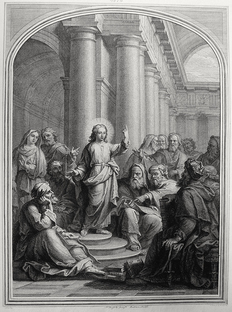 The infancy of Christ in the Bowyer Bible Christ among the doctors of the law Luke 2:46-49 after Poussin