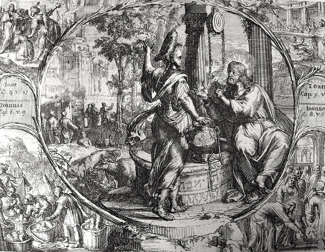 Bowyer Bible print 5333 Jesus and the woman of Samaria John 4:5-9; 5:47; 6:6; 8:6; 8:9 De Hooghe