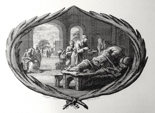 Phillip Medhurst presents Bowyer Bible print 3945 Works of mercy: visiting the sick Matthew 25:35 Elliger on Flickr. A print from the Bowyer Bible, a grangerised copy of Macklin’s Bible in Bolton Museum and Archives, England.