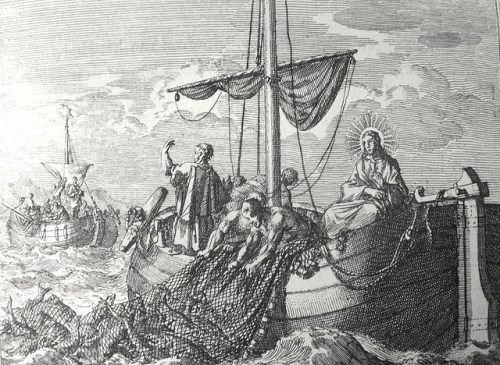 Luke in the Phillip Medhurst Collection 228 The miraculous draught of fishes Luke 5:9-11 after Audran on Flickr. A print from the Phillip Medhurst Collection of Bible illustrations, published by Revd. Philip De Vere at St.George’s Court, Kidderminster.