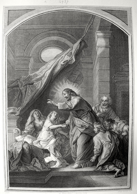 Luke in the Phillip Medhurst Collection 304 Christ raises Jairus’ daughter Luke 8:53-56 Le Brun on Flickr.