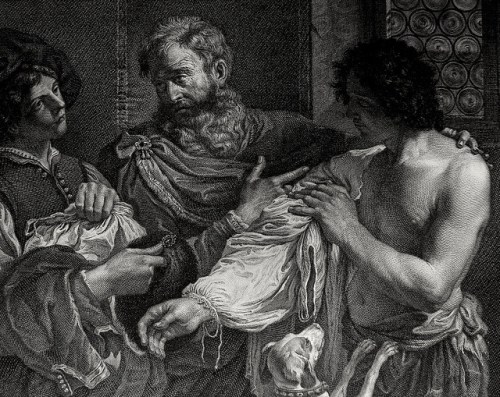 Luke in the Phillip Medhurst Collection 383 The parable of the prodigal son (no 10 in a series of 10) Luke 15:24 Oppenor on Flickr. A print from the Phillip Medhurst Collection of Bible illustrations, published by Revd. Philip De Vere at St. George’s Court, Kidderminster.