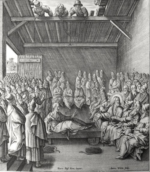 Phillip Medhurst presents Mark’s Gospel: Bowyer Bible print 4254 Christ heals the paralytic Mark 2:4 Marillier on Flickr. A print from the Bowyer Bible, a grangerised copy of Macklin’s Bible in Bolton Museum and Archives, England.