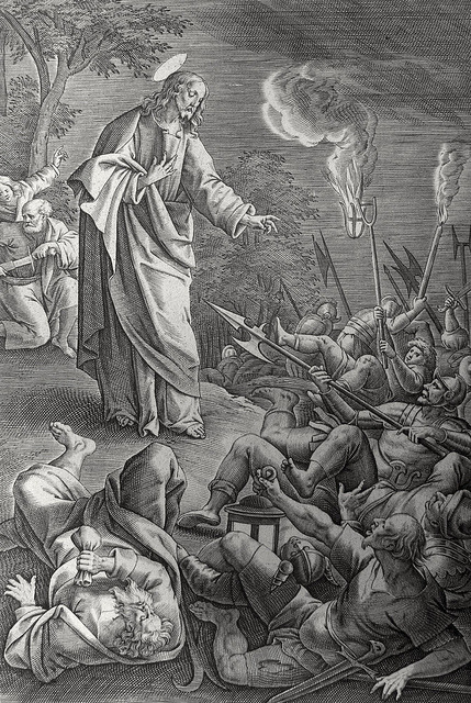 Phillip Medhurst presents John’s Gospel: Bowyer Bible print 5519 Judas betrays Jesus John 18:3-6 De Vos on Flickr. A print from the Bowyer Bible, a grangerised copy of Macklin’s Bible in Bolton Museum and Archives, England.