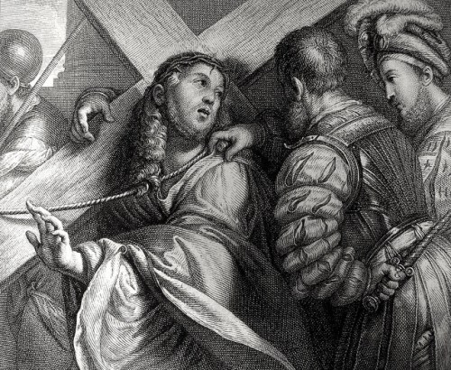 Phillip Medhurst presents John’s Gospel: Bowyer Bible print 5583 Jesus carries his cross John 19:17 after Titian on Flickr. A print from the Bowyer Bible, an extra-illustrated edition of Macklin’s Bible in Bolton Museum and Archives, England.