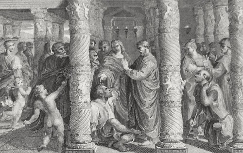 Luke in the Phillip Medhurst Collection 586 Peter and John Acts 3:1-9 De Vos on Flickr. A print from the Phillip Medhurst Collection of Bible illustrations, published by Revd. Philip De Vere at St. George’s Court Kidderminster.