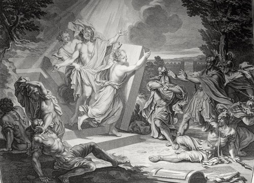 Phillip Medhurst presents Matthew’s Gospel: Bowyer Bible print 4133 The Resurrection Matthew 28:2 Picart on Flickr. A print from the Bowyer Bible, an extra-illustrated copy of Macklin’s Bible in Bolton Museum and Archives, England.