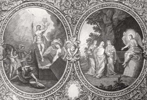 Phillip Medhurst presents Mark’s Gospel: Bowyer Bible print 4455 Christ’s resurrection Mark 16:1-6 Perelle on Flickr. A print from the Bowyer Bible, an extra-illustrated copy of Macklin’s Bible in Bolton Museum and Archives, England.