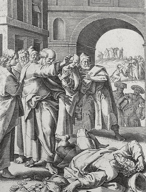 Luke in the Phillip Medhurst Collection 598 The deaths of Ananias and Sapphira Acts 5:5 De Vos on Flickr.