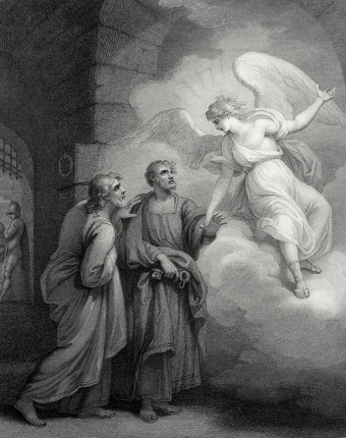 Luke in the Phillip Medhurst Collection 609 The angel comes to deliver the apostles Acts 5:17-20 after Kirk on Flickr. A print from the Phillip Medhurst Collection of Bible illustrations, published by Revd. Philip De Vere at St. George’s Court Kidderminster.
