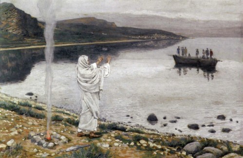 Phillip Medhurst presents 384/392 the James Tissot Jesus c 1896 Christ Appears on the Shore of Lake Tiberias John 21:4-6. By (James) Jacques-Joseph Tissot, French, 1836-1902. Opaque watercolour over graphite on paper.14.9 x 23 cms. Brooklyn Museum New York.