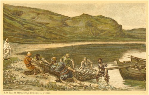 Phillip Medhurst presents 386/392 the James Tissot Jesus c 1896 The Second Miraculous Draught of Fishes John 21:10-11. By (James) Jacques-Joseph Tissot, French, 1836-1902. After a painting now in the Brooklyn Museum, New York; lithograph from “La Vie de Notre Seigneur Jésus Christ … . avec des notes et des dessins explicatifs par J. James Tissot” Publisher: Tours: Alfred Mame et Fils, 1896-97; printed in France by Lemercier.