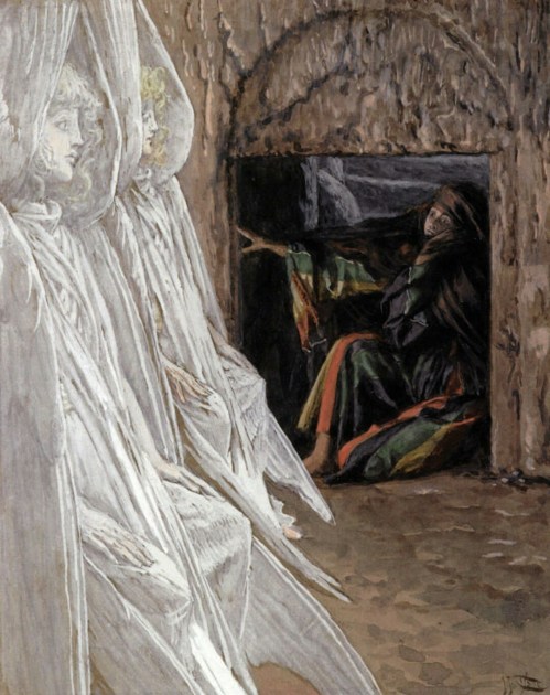Phillip Medhurst presents 374/392 the James Tissot Jesus c 1896 Mary Questions the Angels in the Tomb John 20:11-13. By (James) Jacques-Joseph Tissot, French, 1836-1902. Opaque watercolour over graphite on paper. 18.4 x 14.6 cms. Brooklyn Museum New York.
