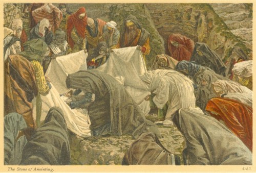 Phillip Medhurst presents 364/392 the James Tissot Jesus c 18964 Mary Kisses the Face of Jesus Before He Is Enshrouded on the Anointing Stone John 19:40. By (James) Jacques-Joseph Tissot, French, 1836-1902. After a painting now in the Brooklyn Museum, New York; chromolithograph from “La Vie de Notre Seigneur Jésus Christ … . avec des notes et des dessins explicatifs par J. James Tissot” 1896-97.