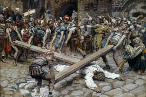 Phillip Medhurst presents 316/392 the James Tissot Jesus c 1896 Simon the Cyrenian Compelled to Carry the Cross with Jesus. By (James) Jacques-Joseph Tissot, French, 1836-1902. Opaque watercolour over graphite on paper. 20.2 x 29.7 cms. Brooklyn Museum New York.