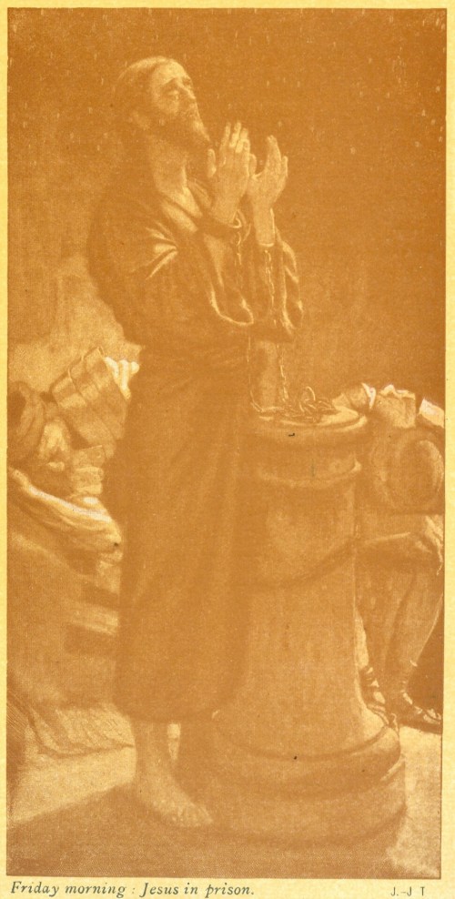 Phillip Medhurst presents 282/392 the James Tissot Jesus c 1896 Good Friday Morning, Jesus in Prison Mark 15:1. By (James) Jacques-Joseph Tissot, French, 1836-1902. Opaque watercolour over graphite on paper. 44.5 x 12.1 cms. Brooklyn Museum New York.