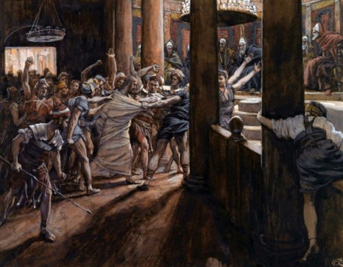 Phillip Medhurst presents 270/392 the James Tissot Jesus c 1896 The Tribunal of Annas John 18:13. By (James) Jacques-Joseph Tissot, French, 1836-1902. After a painting now in the Brooklyn Museum, New York; photogravure from “La Vie de Notre Seigneur Jésus Christ … . avec des notes et des dessins explicatifs par J. James Tissot” 1896-97.