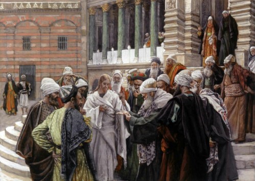 Phillip Medhurst presents 224/392 the James Tissot Jesus c 1896 The Tribute Money Luke 20:20-26. By (James) Jacques-Joseph Tissot, French, 1836-1902. After a painting now in the Brooklyn Museum, New York; chromolithograph from “La Vie de Notre Seigneur Jésus Christ … . avec des notes et des dessins explicatifs par J. James Tissot” 1896-97.