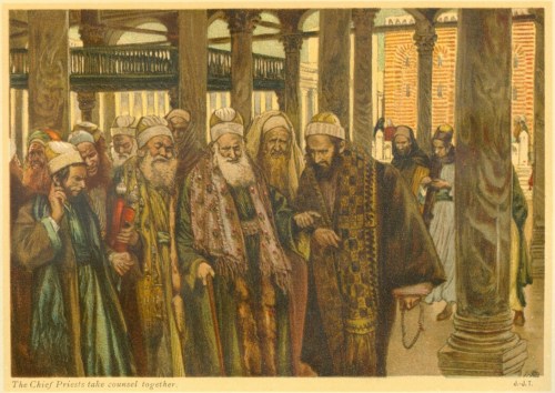 Phillip Medhurst presents 211/392 the James Tissot Jesus c 1896 The Chief Priests Take Counsel Together Mark 11:18. By (James) Jacques-Joseph Tissot, French, 1836-1902. After a painting now in the Brooklyn Museum, New York; chromolithograph from “La Vie de Notre Seigneur Jésus Christ … . avec des notes et des dessins explicatifs par J. James Tissot” 1896-97.