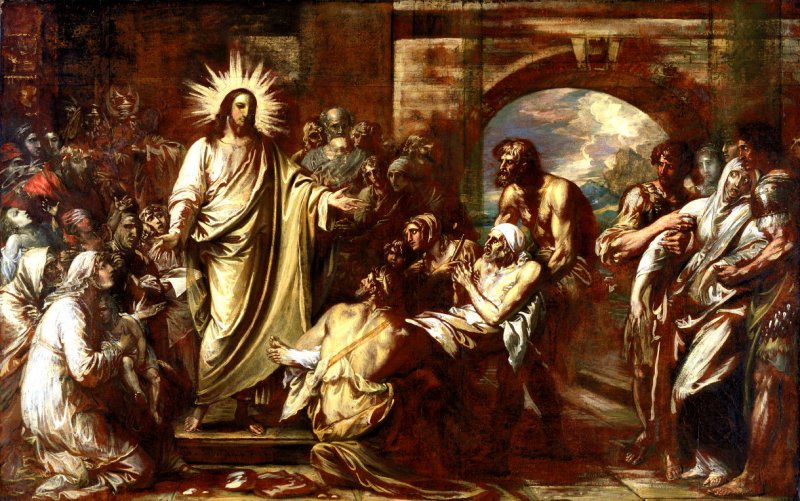 Christ heals the sick in the Temple. c1780-1, completed 1811; 9 x 14 feet; destroyed during WW2. This sketch: 1794. Oil on paper mounted on canvas. 28 5/8 x 45 3/8 ins (72.7 x 115.3 cms). Fine Arts Museum of San Francisco, California. On its completion in 1811 it was exhibited in London to immense crowds, and was subsequently purchased by the British Institution for 3,000 guineas — at that time the largest sum ever paid for a modern work.
