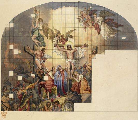 The Crucifixion. Study in oil colour, for a glass painting by Charles Forrest. From 1779 to 1801 West became involved with the restoration of St George’s Chapel in Windsor Castle. He created this design for a new west window, which when completed was to be 28 feet wide by 36 high. The only surviving depiction of its intended appearance is this squared watercolour drawing left by Forrest. Although Forrest commenced painting the glass in 1799, it was still unfinished at the time of his death in 1807. The window was eventually put in pieces into store. In 1846 it was presented to St Paul’s cathedral in Calcutta, where twenty years later it was totally destroyed by a cyclone.