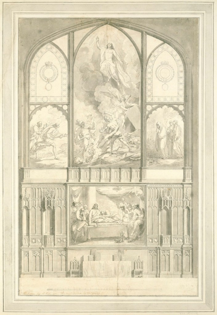 The Last Supper and The Resurrection. Design for the East Window, St. George’s Collegiate Chapel, Windsor, 1781. Drawing; pen and ink on wash on paper. 635 mms x 410 mms. Royal Academy of Arts. Burlington House, Piccadilly, London. From 1779 to 1801 West became involved with the large-scale restoration of St George’s Chapel in Windsor Castle. As part of the project, he produced an altar painting depicting the Last Supper and various designs for stained glass including the east window. The new window was created as a vast triptych, with three separate sections depicting the story of Christ’s resurrection. The central panel featured Christ emerging from the tomb, with the side panels depicting Saints Peter and John and the three Marys heading towards the tomb. The whole was intended to make a dramatic backdrop to the altar. The latest fashion for vast picture windows, with large panels of glass being painted as if on canvas, enabled designers to create images which filled the whole space expressively, without being broken up by lead supports. A design was drawn up by West, with the glass painted by Charles Forrest. The east window was replaced in 1862 to make way for a memorial to Prince Albert. The glass was removed in 1862 and packed into cases. Where the window went or what became of the cases is unknown. The final piece of Benjamin West’s vision for the Chapel, the altar painting of the Last Supper, was sold at auction in 1978.