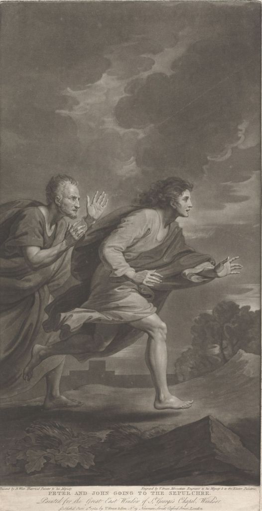 Peter and John run to the tomb of Christ. 1784. Image of the left panel for the east window of St George’s Chapel. Print made by Valentine Green after West. Mezzotint on moderately thick, moderately textured, cream laid paper. Sheet: 18 9/16 x 9 5/8 ins (47.1 x 24.5 cms), Plate: 18 3/8 x 9 7/16 ins (46.6 x 23.9 cms), image: 17 3/8 x 9 7/16 ins (44.2 x 23.9 cms). Lettered: “Painted by B. West, Historical Painter to his Majesty. PETER AND JOHN GOING TO THE SEPULCHRE. Painted for the Great East Window of St, George’s Chapel, Windsor. Publish’d June 4th. 1784, by V. Green & Son, No 29 Newman Street, Oxford Street, London. Engravd by V. Green Mezzotinto Engraver to his Majesty & to the Elector Palatine.” Yale Center for British Art, Paul Mellon Collection.
