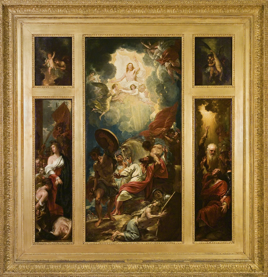 The Conversion of Saint Paul (centre); Saint Paul Persecuting the Christians (left); and Ananias Restoring Saint Paul’s Sight (right). 1786. Oil on canvas. All panels together: 56 x 54 ins; 142.24 x 137.16 cms. Five Colleges and Historic Deerfield Museum Consortium, Amherst. In the left panel, Paul is presented as a Roman soldier who persecuted Christians. The central panel shows the moment of his conversion to Christianity. In the right panel, he is baptized as a Christian and his sight is restored. The painting is one of two large, finished studies West created (the other is in the Dallas Museum of Art) for a window in St. Paul’s Church in Birmingham, England. This is the later, sketchier treatment, painted in response to the acclaim with which the altarpiece was greeted when it was exhibited in London at the Royal Academy.)