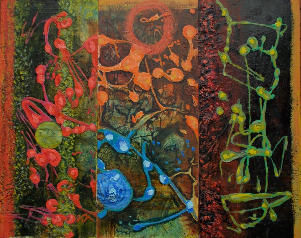 “Synapheatic Triptych” by Phillip Medhurst. 2014. Acrylic and plaster on wood. Triptych, each panel 20 x 48 ins.