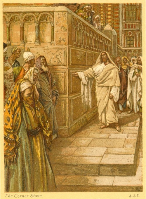 Phillip Medhurst presents 223/392 the James Tissot Jesus c 1896 The Corner Stone Matthew 21:42-46. By (James) Jacques-Joseph Tissot, French, 1836-1902. After a painting now in the Brooklyn Museum, New York; chromolithograph from “La Vie de Notre Seigneur Jésus Christ … . avec des notes et des dessins explicatifs par J. James Tissot” 1896-97.