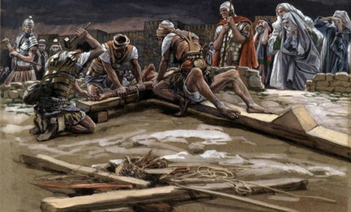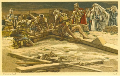 Phillip Medhurst presents 329/392 the James Tissot Jesus c 1896 The First Nail. By (James) Jacques-Joseph Tissot, French, 1836-1902. After a painting now in the Brooklyn Museum, New York; chromolithograph from “La Vie de Notre Seigneur Jésus Christ … . avec des notes et des dessins explicatifs par J. James Tissot” 1896-97.