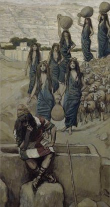 Phillip Medhurst presents 104/788 James Tissot Bible c 1899 Moses at the well at Midian Exodus 2:15 Jewish Museum New York. By a follower of (James) Jacques-Joseph Tissot, French, 1836-1902. Gouache on board.