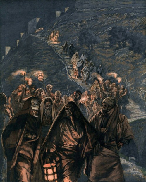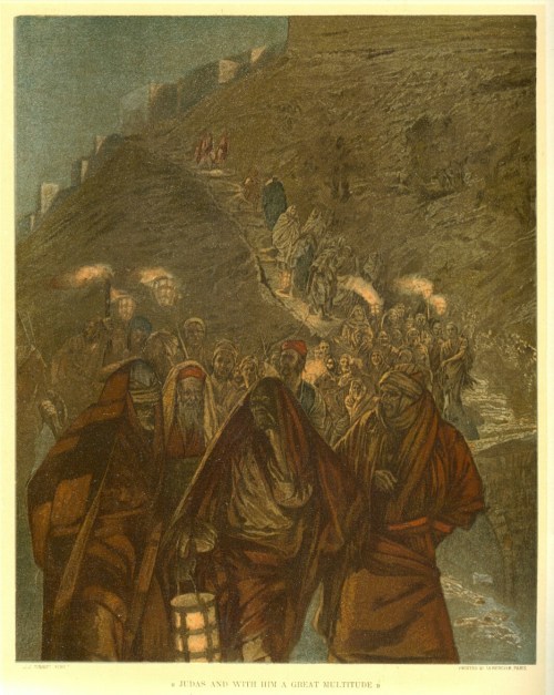 Phillip Medhurst presents 258/392 the James Tissot Jesus c 1896 The Procession of Judas Matthew 26:47. By (James) Jacques-Joseph Tissot, French, 1836-1902. After a painting now in the Brooklyn Museum, New York; chromolithograph from “La Vie de Notre Seigneur Jésus Christ … . avec des notes et des dessins explicatifs par J. James Tissot” 1896-97.