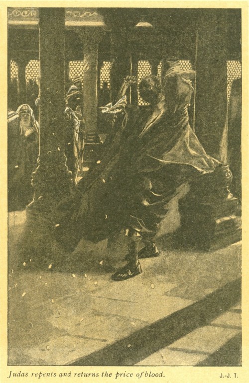 Phillip Medhurst presents 284/392 the James Tissot Jesus c 1896 Judas Returns the Money Matthew 27:2-10. By (James) Jacques-Joseph Tissot, French, 1836-1902. After a painting now in the Brooklyn Museum, New York; photogravure from “La Vie de Notre Seigneur Jésus Christ … . avec des notes et des dessins explicatifs par J. James Tissot” 1896-97.