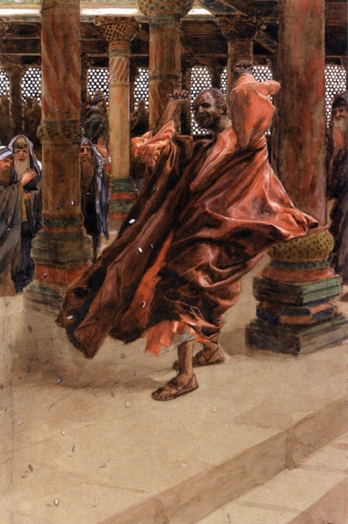Phillip Medhurst presents 284/392 the James Tissot Jesus c 1896 Judas Returns the Money Matthew 27:2-10. By (James) Jacques-Joseph Tissot, French, 1836-1902. Opaque watercolour over graphite on paper. 30 x 19.7 cms. Brooklyn Museum New York.