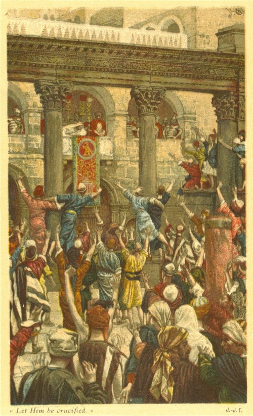 Phillip Medhurst presents 303/392 the James Tissot Jesus c 1896 Let Him Be Crucified Matthew 27:23. By (James) Jacques-Joseph Tissot, French, 1836-1902. After a painting now in the Brooklyn Museum, New York; chromolithograph from “La Vie de Notre Seigneur Jésus Christ … . avec des notes et des dessins explicatifs par J. James Tissot” 1896-97.